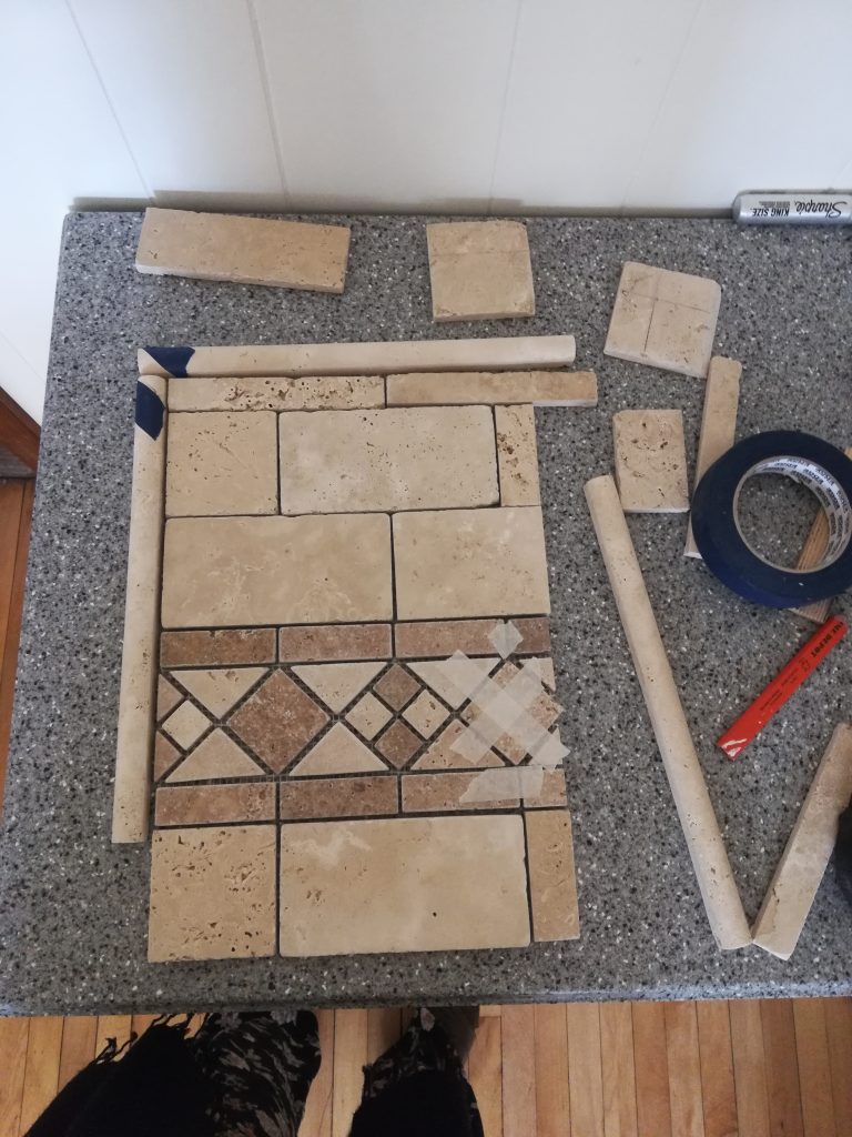 See? The section of ornate tiles in the middle is the decorative strip (around $11 per linear foot) and the rectangular block tiles are just separate ordinary travertine which were less pricey, around $5.50 per square foot.