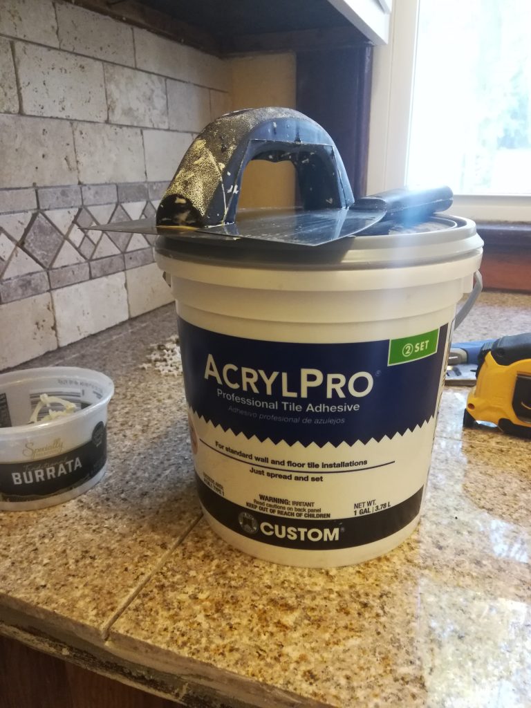 We also decided to use mastic instead of thinset for this installation, which makes life a lot easier. This is because mastic doesn’t harden in the container, so you can take as long as you need to when tiling. Plus, it’s less messy than thinset. Here’s a link to the one below.