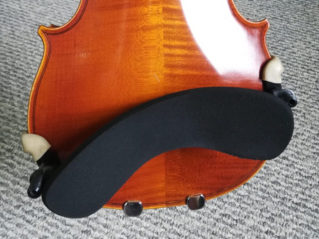 Now, in the first image below, you’ll notice that the two feet of the shoulder rest are at the same level. In addition, each sits at the widest part of the lower bout. This is by far the most popular way to position a shoulder rest. And, for some people, it will be the best position! Of course, the only way to find out is to experiment yourself with the different positions.