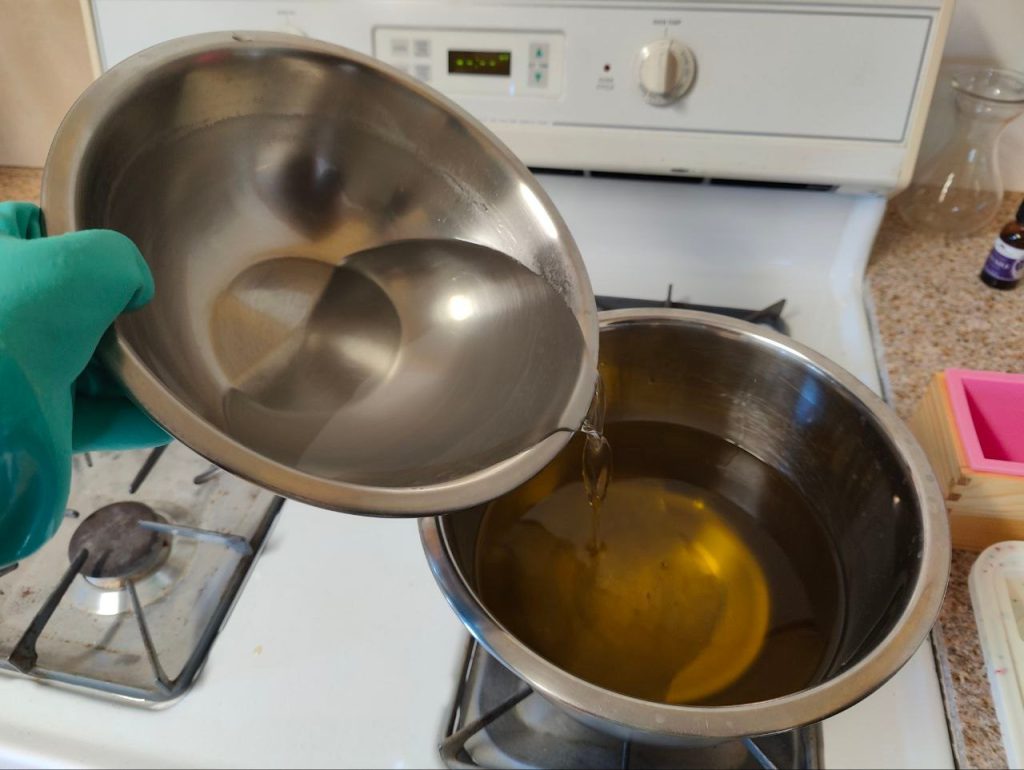 - Weigh olive and coconut oils into stainless steel pot/bowl, then melt on low heat if not already melted.