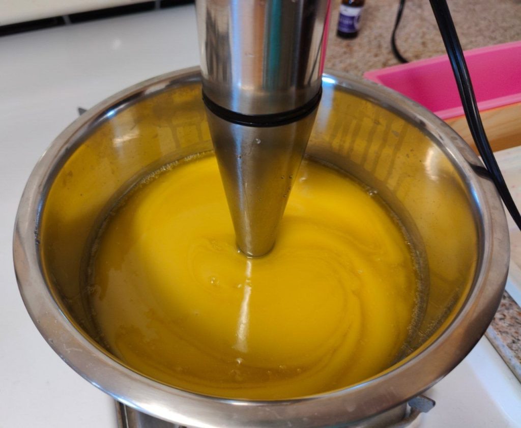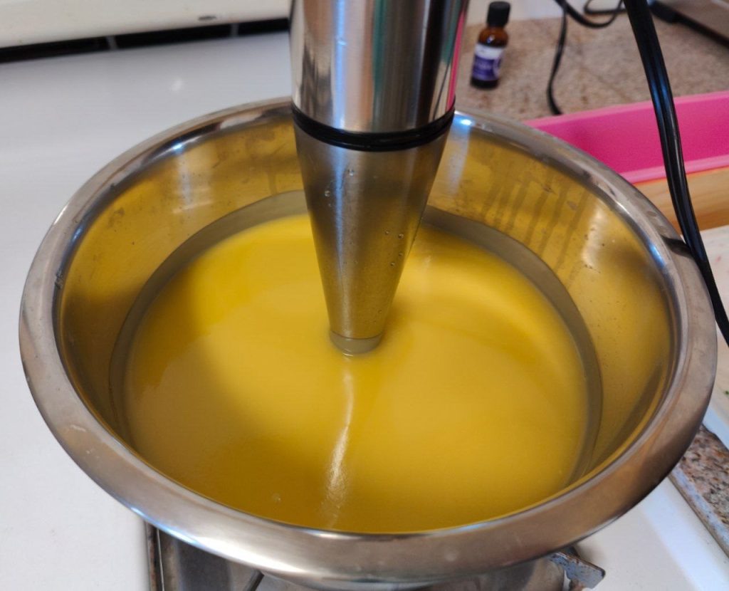 - With molds and blender ready to go, add lye solution to the oils, immediately blending with the immersion blender until combined and thick, approximately 10-20 seconds.