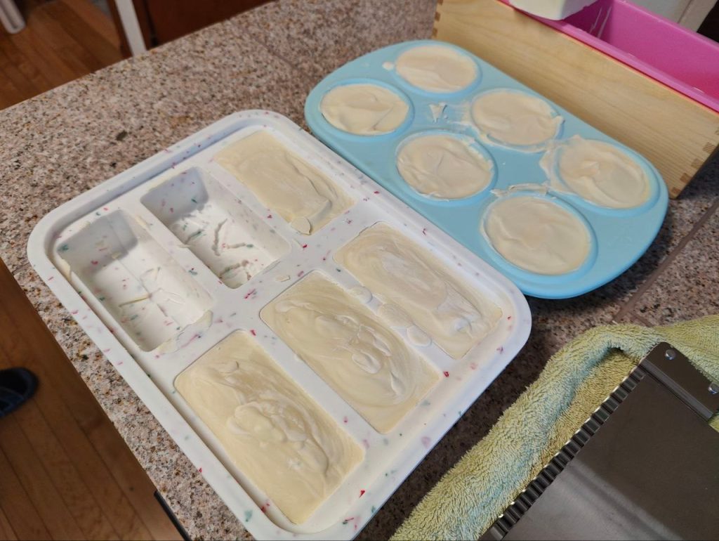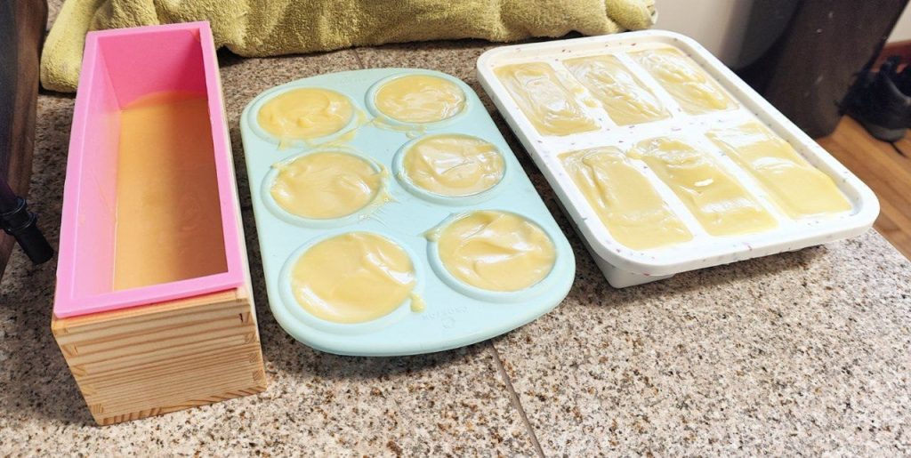 As you can probably see in the picture above I first filled the muffin trays and then put whatever I had leftover in the bigger mold. It’s always a good idea to have more molds than you need in case there’s some extra soap batter! Plastic tupperware can also be great in a pinch.