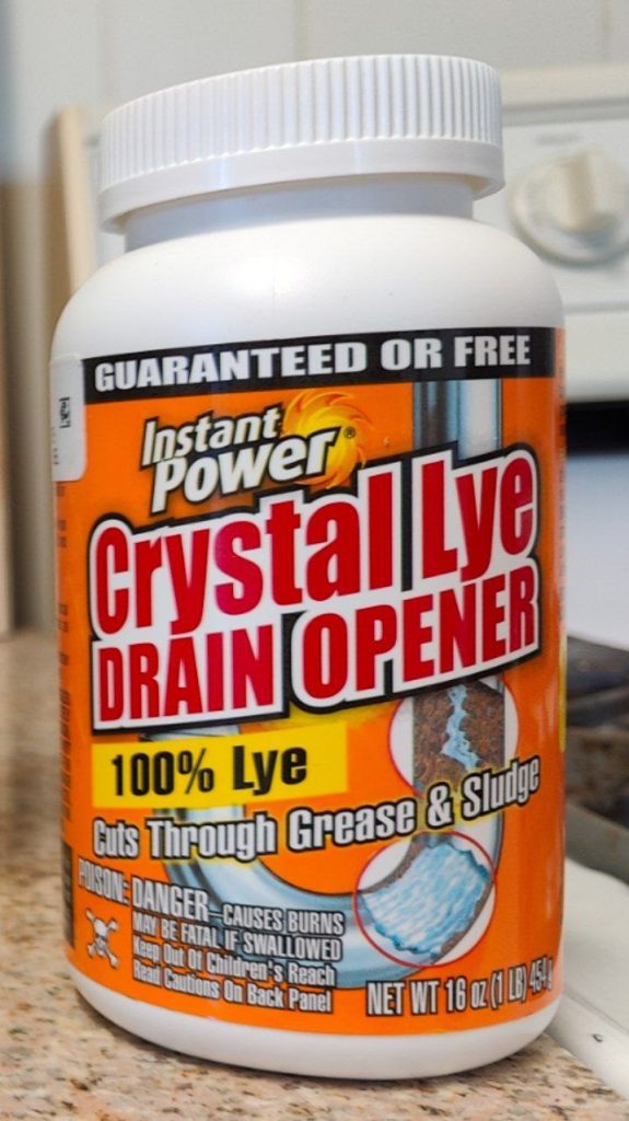 - Lye (sodium hydroxide, NaOH) – I prefer to use this really cheap crystal lye drain opener