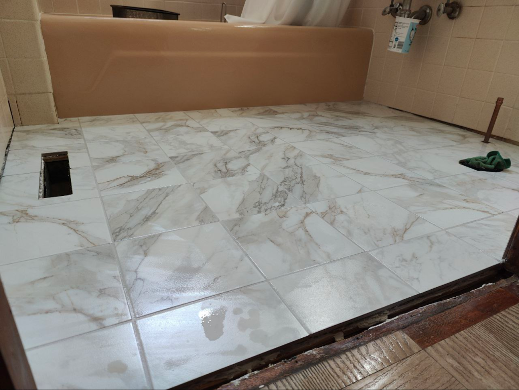 Like I said, try to come back for a second check just to make sure, once the tile has dried from the second wash, that you got everything. On this last project, I noticed residue in the shape of my sneaker prints on the tile a day later. I quickly sprayed vinegar and scrubbed it off the next day, but likely if I had noticed it a few days later it wouldn’t have budged.