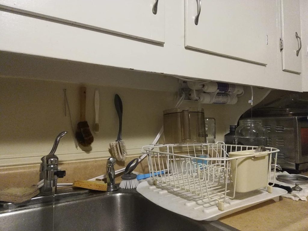As I’ve mentioned throughout this article, a reverse osmosis countertop filter does take up counter space. I sort of just keep mine behind the dish rack beside the sink, so it doesn’t bother me too much. In my old apartment, I even had it mounted to the cupboards above to free up room! See?