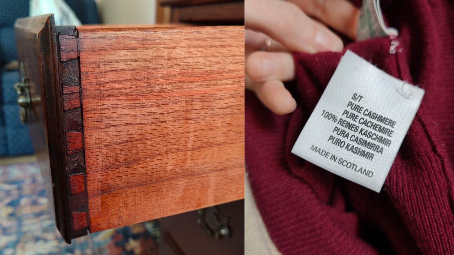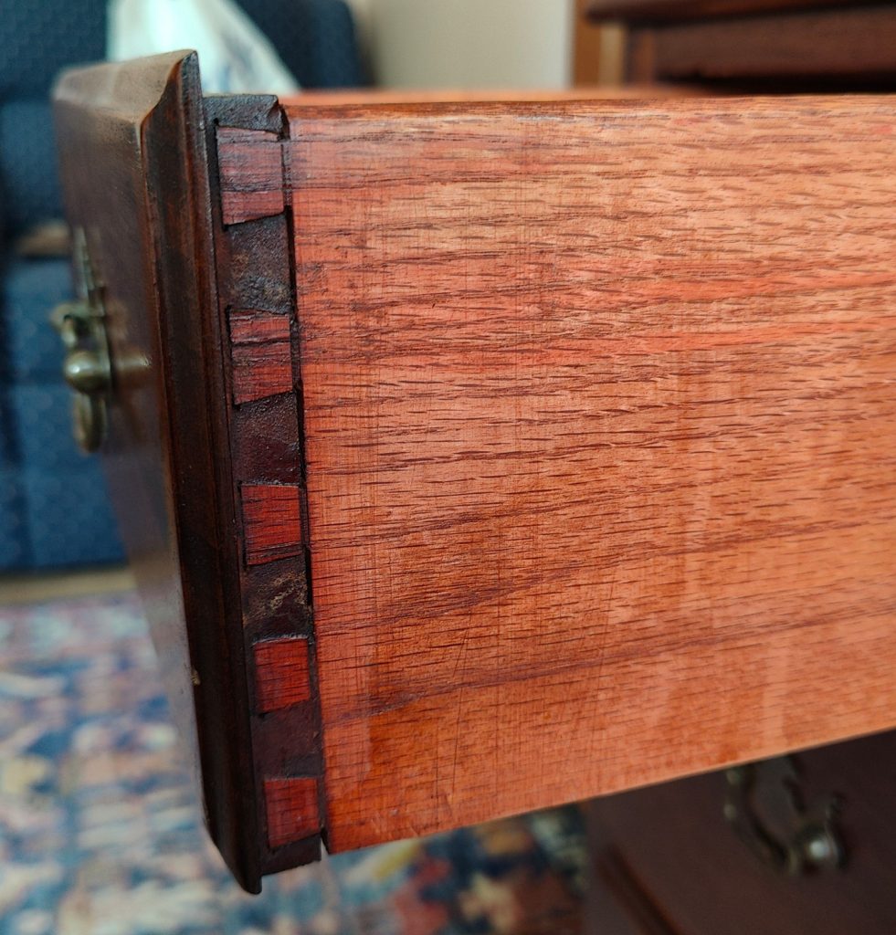Quality vintage furniture is made from solid hardwood and has fancy joinery of wood pieces (think dovetails for drawers, like in the following photo!).
