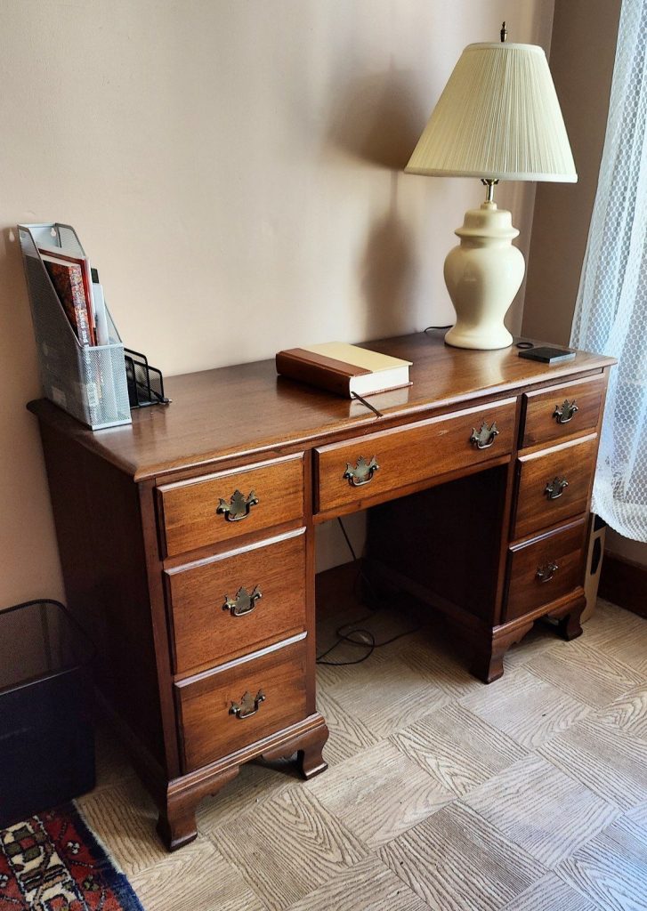Though I must say that our absolute best find so far as been this vintage all solid-mahogany desk that we saw at Goodwill. It was in incredibly good condition and only $50! I jumped on that so fast and we took it home the same day. So beautiful!
